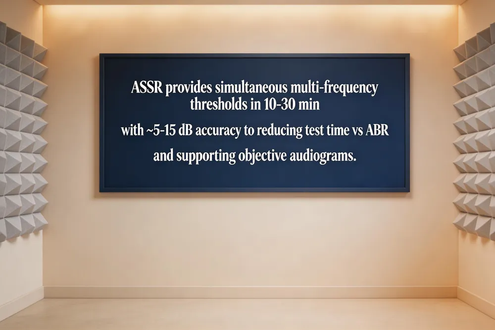 The Auditory Steady‑State Response (ASSR) is an objective, frequency‑specific electrophysiologic test that estimates hearing thresholds without requiring patient cooperation. By presenting rapid, amplitude‑ and frequency‑modulated tones (typically 500 Hz, 1 kHz, 2 kHz, and 4 kHz) simultaneously to both ears, ASSR can generate a detailed audiogram in 10‑30 minutes, reducing test time up to 40 % compared with serial ABR testing (AAO, 2023). Its statistical detection algorithm (F‑test) and use of high‑modulation rates (80‑100 Hz) ensure reliable brainstem‑derived responses even when patients are asleep or lightly sedated, making ASSR invaluable for newborn screening, developmental disabilities, and occupational injury assessments where behavioral audiometry is unreliable (WHO, 2025; NorCal Medical Consulting, 2024).