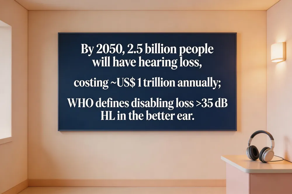 By 2050 nearly 2.5 billion people worldwide are expected to have some degree of hearing loss, with >700 million requiring rehabilitation. Unaddressed loss incurs an annual global cost of almost US$ 1 trillion, underscoring the economic urgency of early detection.