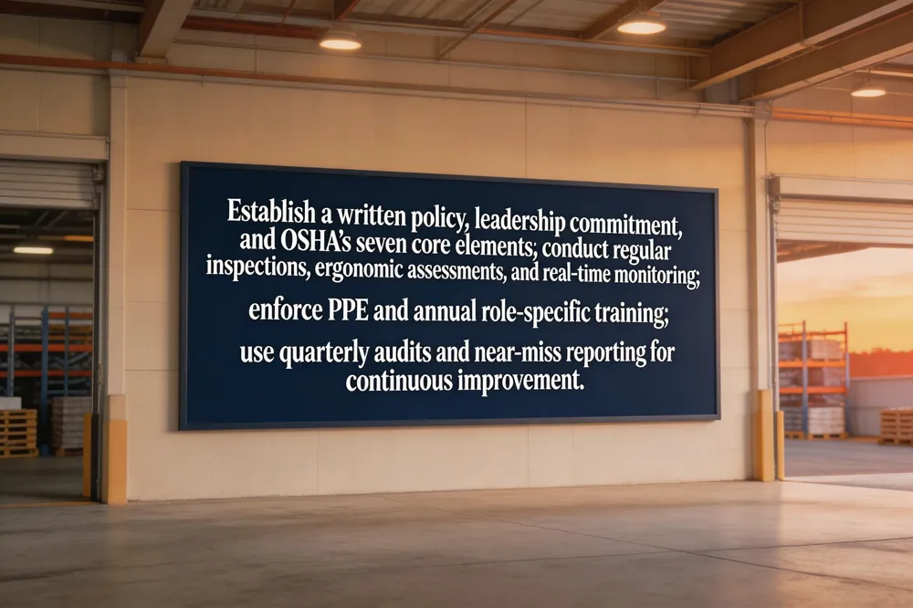 Best way to prevent injuries? Embed a comprehensive safety and wellness program, match jobs to worker capabilities, enforce PPE, maintain staffing levels, and conduct routine hazard inspections.
