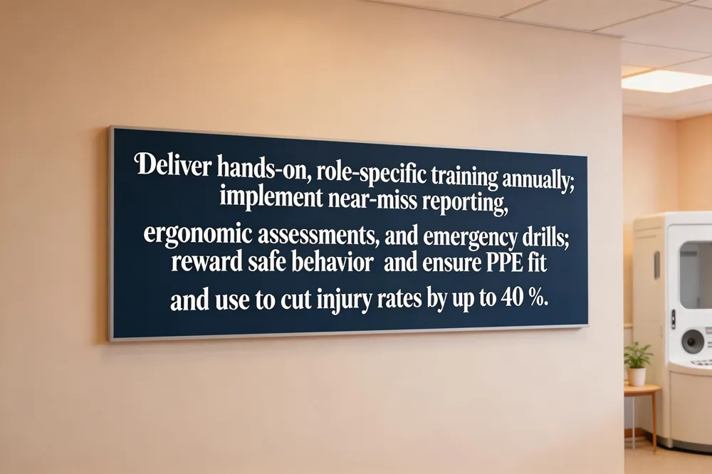 New ideas for safety improvement – Implement continuous noise‑monitoring devices with real‑time alerts; launch a confidential near‑miss reporting platform and involve staff in hazard‑control brainstorming; schedule short stretch breaks and ergonomic workstation adjustments; reward compliance and model safe behavior at leadership levels; partner with occupational‑health clinicians for expert injury assessments and streamlined return‑to‑work plans.