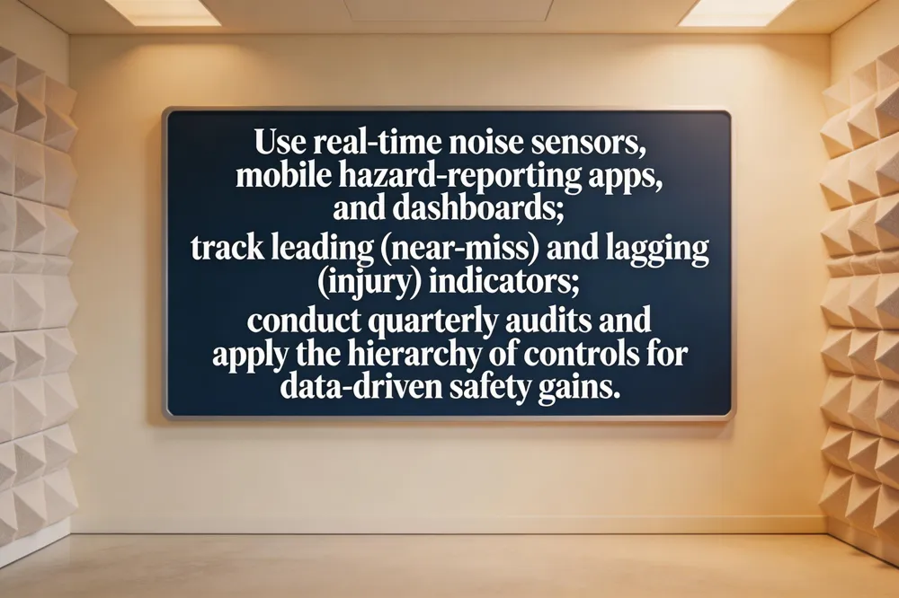 Real‑time monitoring, such as continuous noise‑level sensors that alert workers when sound exceeds 85 dB, enables early identification of auditory hazards and supports OSHA‑mandated hearing‑conservation programs. Quarterly safety audits and inspections systematically uncover slip, trip, fall, and ergonomic risks, driving a 15%‑40% improvement in safety‑culture scores and a 25% reduction in injury rates when combined with near‑miss reporting. Metrics and performance tracking—using leading indicators like near‑miss reports and lagging indicators such as recordable injury rates—provide the data backbone for continuous improvement and compliance with OSHA’s seven core elements. Technology tools, including mobile hazard‑reporting apps, real‑time dashboards, and wearable ergonomics monitors, streamline hazard communication and reinforce the hierarchy of controls.