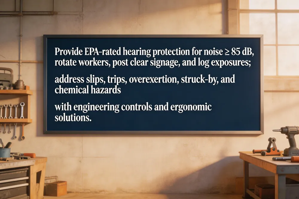 Examples of safety suggestions – Provide EPA‑rated hearing‑protection (earmuffs or earplugs) and enforce use where noise exceeds 85 dB(A); conduct monthly sound‑level surveys and post clear signage; rotate workers to limit time in high‑noise zones; train staff on proper fit and maintenance of protectors; keep exposure logs and audiometric records to support future claims.
