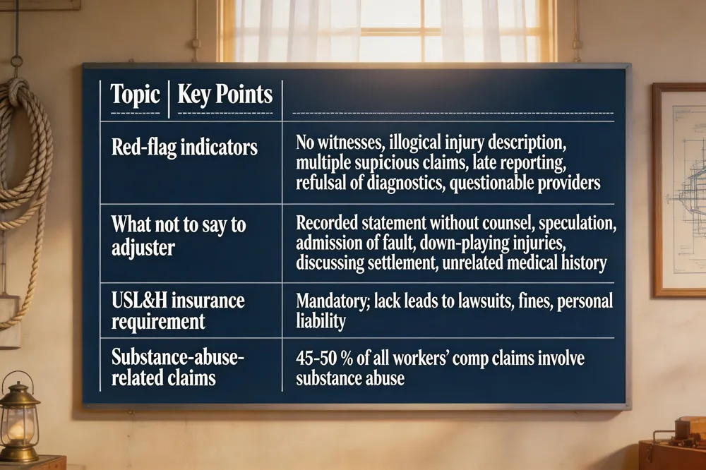 Red flag in workers' compensation claims – Absence of witnesses, illogical injury descriptions, multiple suspicious past claims, late reporting, refusal of diagnostic testing, and use of questionable medical/legal providers signal potential fraud and merit closer scrutiny.