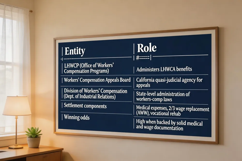 The LHWCP is run by the U.S. Department of Labor’s Office of Workers’ Compensation Programs, administering benefits. The Workers’ Compensation Appeals Board is a legitimate California quasi‑judicial agency. A Longshore workers‑comp settlement includes medical expenses, two‑thirds wage replacement based on AWW, and vocational rehabilitation. Workers‑compensation laws are administered by the Division of Workers’ Compensation within Department of Industrial Relations. Winning odds are high when claims are backed by medical and wage documentation.
