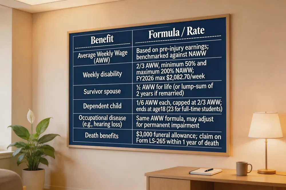 Under the LHWCA the Average Weekly Wage (AWW) is calculated from the employee’s pre‑injury earnings, using the most recent wage statements and the National Average Weekly Wage (NAWW) as a benchmark. Weekly disability benefits are paid at two‑thirds of the AWW, but no less than 50 % and no more than 200 % of the NAWW; the FY 2026 maximum is $2,082.70 per week (twice the NAWW of $1,041.35). Survivor benefits are based on two‑thirds of the deceased worker’s AWW: a surviving spouse receives one‑half of the AWW for life (or a lump‑sum of two years’ benefits if remarried), and each dependent child receives one‑sixth, capped at two‑thirds of the AWW, with payments ending at age 18 (or 23 for full‑time students). Occupational diseases such as hearing loss are treated as compensable injuries; the same AWW formula applies, and the benefit amount may be adjusted for the degree of permanent impairment. Death benefits include a $3,000 funeral allowance and must be filed on Form LS‑265 within one year of death.