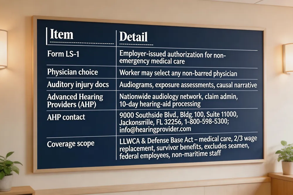 Under the Longshore and Harbor Workers’ Compensation Act (LHWCA), the employer must issue Form LS‑1 to authorize any non‑emergency medical care. The employee retains the statutory right to select a treating physician of choice, provided the doctor is not barred from the LHWCA program. For occupational hearing loss, the claimant must submit contemporaneous audiograms, exposure assessments, and a clear causal narrative linking noise levels on the dock or vessel to the impairment. Advanced Hearing Providers (AHP) serve as a full‑service hearing‑health partner; AHP’s nationwide network of credentialed audiologists delivers prompt evaluations, handles claim administration, and ensures OSHA‑compliant hearing‑conservation programs. AHP processes hearing‑aid claims within ten days, conducts free clinical reviews, and eliminates unnecessary high‑end product requests, saving employers time and money while protecting worker health. AHP’s headquarters are located at 9000 Southside Blvd., Building 100, Suite 11000, Jacksonville, FL 32256; toll‑free assistance is available at 1‑800‑598‑5300 and via email at info@hearingprovider.com. Maritime workers’ compensation, governed by LHWCA and extensions such as Defense Base Act, provides medical care, two‑thirds wage replacement, and survivor benefits for non‑seaman marine employees, including those with hearing loss. The program covers shipbuilders, ship‑repairers, longshoremen, and harbor‑construction workers, but excludes seamen, federal employees, and non‑maritime staff.