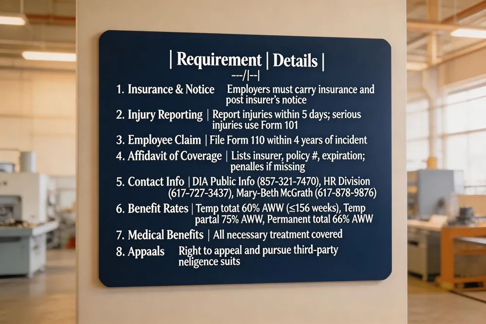 Massachusetts workers’ compensation is governed by MGL c. 152 and administered by the Department of Industrial Accidents (DIA). Employers must carry insurance, post the insurer’s notice, and report injuries within five days; serious injuries require Form 101, and employees file Form 110 (Employee Claim) within four years of the incident. The Workers’ Compensation Affidavit verifies coverage, listing insurer name, policy number, and expiration date; failure to provide it can lead to criminal and civil penalties. Key contacts include the DIA Public Information Office at (857) 321‑7470, the Human Resources Division at (617) 727‑3437, and claims assistance via Mary‑Beth McGrath at (617) 878‑9876. Settlement benefits follow a chart: temporary total incapacity pays 60 % of the average weekly wage (AWW) up to 156 weeks, temporary partial up to 75 % of that amount, and permanent total incapacity 66 % of AWW for life. Medical benefits cover all necessary treatment, and the system allows appeals and third‑party negligence suits when appropriate.