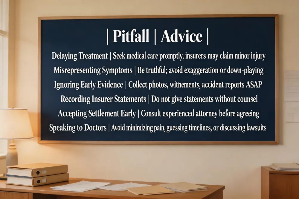 Many claimants delay or refuse medical treatment, giving insurers a basis to argue the injury is minor or unrelated. Ignoring prescribed treatment plans, misrepresenting symptom severity, and failing to collect early evidence—photos, witness statements, accident reports—undermine credibility. Recording statements to the opposing insurer without counsel often results in admissions that limit recovery. Finally, accepting a settlement without consulting an experienced injury‑law attorney can lead to under‑compensation for medical costs, lost wages, and future disability.