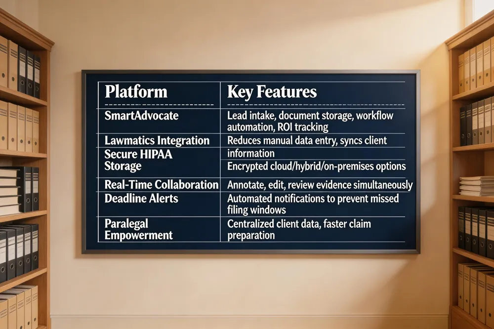 Legal case management software such as SmartAdvocate delivers measurable ROI by streamlining lead intake, document storage, and workflow automation. Recognized as the 2025 LegalTech Breakthrough "Case Management of the Year," SmartAdvocate serves over 20,000 attorneys across solo practices, large firms, and municipal departments, and integrates with Lawmatics to reduce manual data entry. Its flexible deployment options—cloud, hybrid, or on‑premises—meet the security and compliance standards of U.S. law firms. Empowering paralegals through a unified platform centralizes client data, including medical records, photos, and insurance policies, while built‑in deadline alerts and automated communications prevent missed filing windows in workplace‑injury cases. Real‑time collaboration tools enable attorneys, paralegals, medical experts, and claimants to annotate, edit, and review evidence—such as auditory‑loss assessments—simultaneously, improving accuracy and reducing miscommunication. Secure, HIPAA‑compliant storage ensures that sensitive health information remains protected while supporting faster, evidence‑based claim preparation.