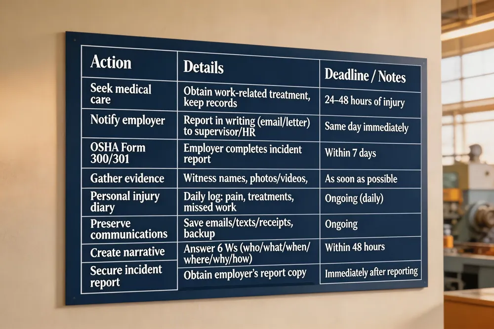 Step‑by‑step checklist: (1) Immediately write a work‑injury statement with date, time, location, activities, witnesses, injuries and treatment. (2) Take dated photos/video of the scene, equipment and visible injuries. (3) Get written witness statements with contact info. (4) Secure employer’s incident report and Form 301. (5) Collect all medical records, bills and receipts for out‑of‑pocket costs. (6) Keep a pain and work‑loss log. Timing and deadlines: notify employer within statutory period (e.g., 30 days, 90 days in SC), file claim (Form 50, Form 410) within state’s filing window, and retain OSHA logs for five years. Involve legal and medical experts when injury is serious, claim is denied, or expert testimony (e.g., audiology) needed.