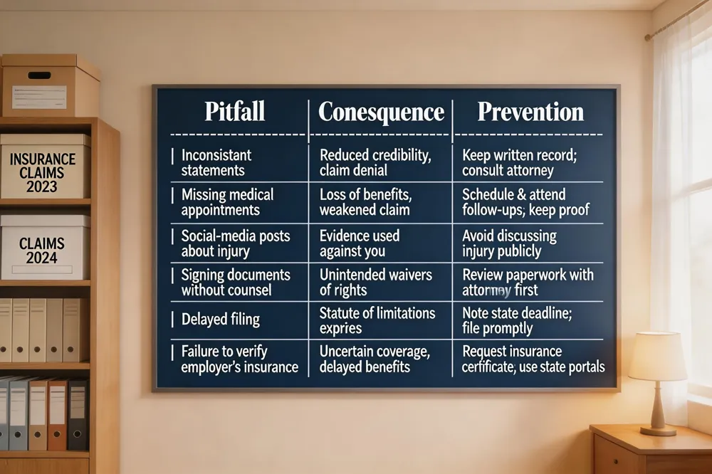 Common claim mistakes include giving inconsistent statements to insurers, missing medical appointments, posting injury details on social media, signing documents without counsel, and delaying filing past statutory deadlines. These errors can undermine the credibility of a claim and reduce recoverable benefits.