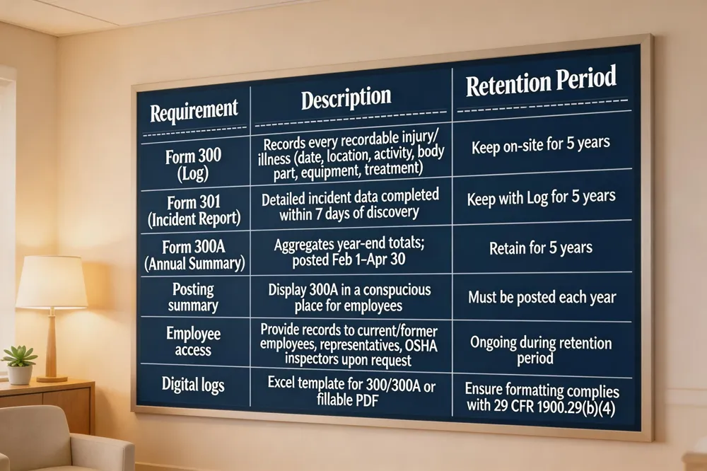 What are the OSHA 300 Log requirements? Keep the log on‑site for five years, post the 300A summary, and retain all related documentation for employee access and OSHA inspection.