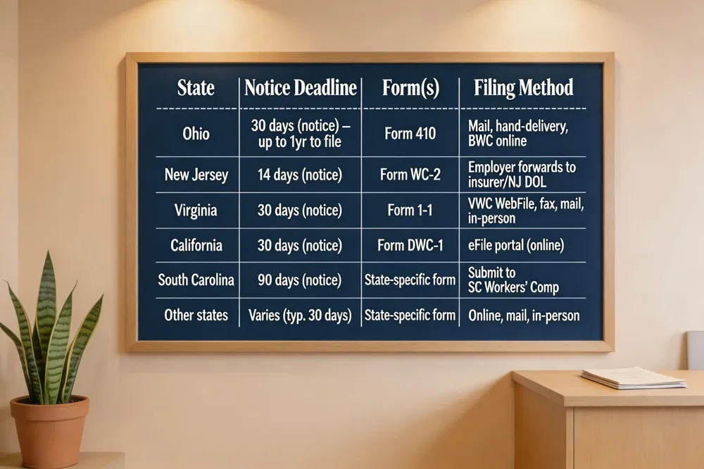 Ohio – Notify your employer within 30 days, then submit Form 410 (First Report of Injury) either by mail, hand‑delivery, or through the Ohio Bureau of Workers’ Compensation (BWC) online portal. The BWC assigns a claim number and must investigate within 28 days; you have up to one year (two for occupational disease) to file the notice.
