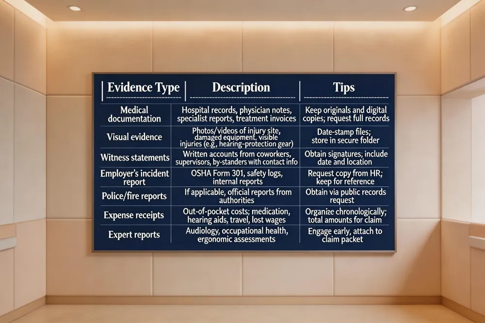 What evidence do I need for an injury claim? Collect complete medical documentation—hospital records, physician and specialist notes, audiology reports, and all treatment invoices. Preserve photographic or video evidence of the injury site, damaged equipment, and any visible signs of the injury (e.g., hearing‑protection gear). Obtain written statements from coworkers, supervisors, or other witnesses who saw the incident, and retain the employer’s official incident report, safety logs, and any police or fire‑department reports. Finally, keep receipts for out‑of‑pocket costs such as medication, hearing aids, travel to appointments, and documented lost wages.