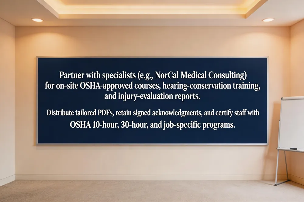 For quick reference, you can use OSHA‑based PDFs such as the “Construction Safety & Injury Prevention Program” workbook or the University of Maine’s “Basic Safety Training Resource Guide.” Tailor these documents to emphasize auditory‑hazard awareness, noise‑level monitoring, and proper hearing‑protection equipment—key concerns for NorCal Medical Consulting’s medical‑expert services. Distribute the finalized PDFs to all staff and retain signed acknowledgments for compliance and legal support.