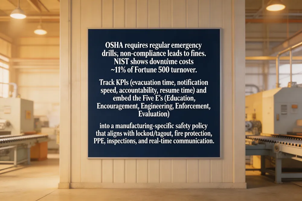 OSHA mandates regular emergency preparedness drills for manufacturing facilities for all manufacturing facilities; failure to comply can trigger fines and legal liability. NIST reports downtime costs thousands per minute — amounting to roughly 11 % of annual turnover for Fortune 500 manufacturers — about $1.5 trillion each year. To evaluate drill effectiveness, key performance indicators (KPIs) such as evacuation time, notification speed, personnel accountability, and time to resume operations are tracked. The Five E’s of workplace safety—Education, Encouragement, Engineering, Enforcement, and Evaluation provide a framework for building a robust safety culture. A manufacturing‑specific safety policy should embed these principles, aligning with OSHA standards on lockout/tagout, fire protection, and PPE, while mandating routine inspections, hazard assessments, and documented corrective actions. The policy must also prescribe clear emergency response procedures, real‑time communication tools, and continuous monitoring of safety metrics. By integrating digital emergency management platforms that capture drill data, companies can demonstrate compliance, reduce injury‑related claims, and support expert witness testimony in legal and insurance matters. Documented drill outcomes also provide medical evaluators with objective evidence, facilitating accurate injury assessments and strengthening legal defense in workers’ compensation and liability claims.