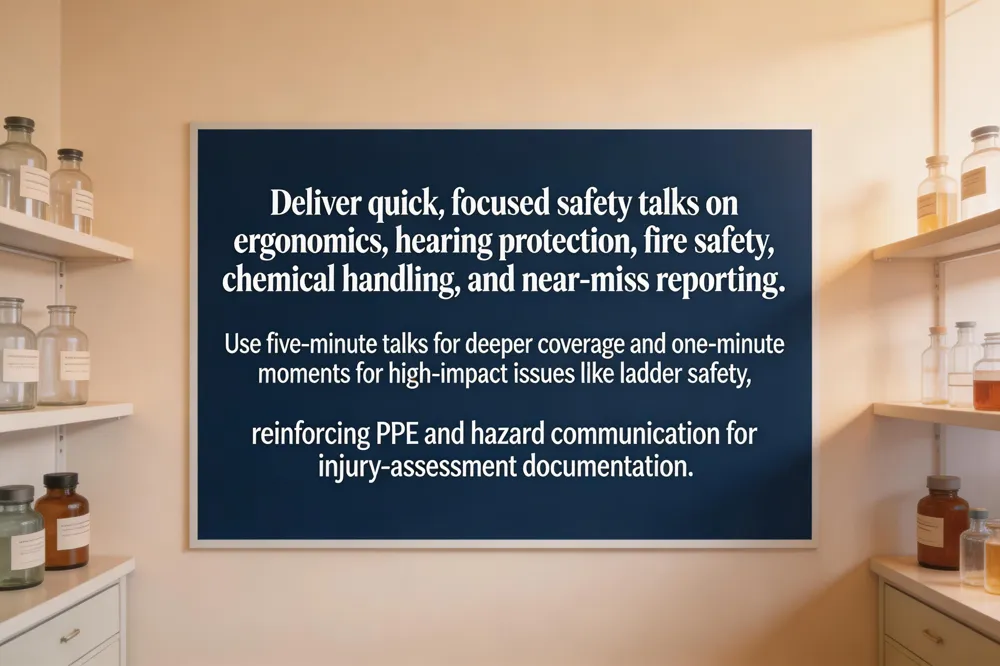 One‑minute safety moments focus on a single high‑impact issue—such as ladder safety or fire‑extinguisher use—and highlight common mistakes and corrective actions, reinforcing PPE compliance and hazard communication that are essential for injury‑assessment accuracy.