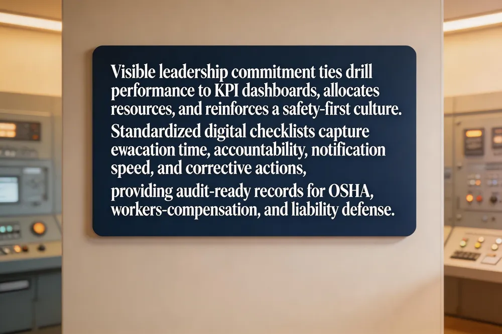 Evaluation of Drill Performance & KPIs Track evacuation time, notification speed, personnel accountability, and time to resume operations. Use real‑time data from digital systems (e.g., EmergencyOS) to establish baselines, conduct post‑drill analysis, and drive data‑driven improvements that lower injury rates, support medical‑assessment claims, and satisfy OSHA compliance.