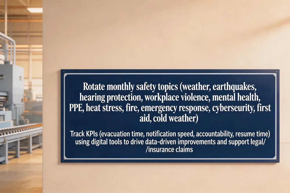 Regulatory drivers for emergency drills come from OSHA’s mandate that manufacturing plants maintain an Emergency Action Plan and conduct regular evacuation, fire, and lockout/tagout exercises, with non‑compliance risking fines and penalties. Unplanned downtime costs are staggering: NIST reports losses of thousands of dollars per minute, amounting to roughly 11 % of annual turnover for Fortune 500 manufacturers—about $1.5 trillion each year. To safeguard production, drills are scheduled during low‑activity windows such as shift changes, early mornings, or planned maintenance, minimizing disruption while preserving realism. Short micro‑drills embedded in daily shift briefings or toolbox talks build muscle memory, improve KPI performance (evacuation time, notification speed, accountability) and support continuous improvement. Post‑drill analysis feeds into an improvement cycle, letting managers adjust scenarios, refine communication, and document compliance for auditors.