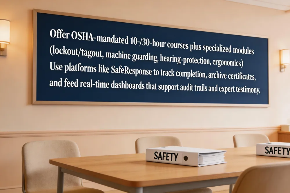 Employees receive OSHA‑mandated 10‑ or 30‑hour courses, plus specialized modules on lockout/tagout, machine guarding, hearing‑protection fit‑testing, ergonomics, and forklift safety. Each module is documented and refreshed to meet regulatory and legal standards.