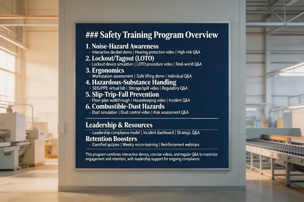 Courses cover lockout/tagout, machine guarding, noise‑hearing protection, and chemical‑spill response, all tailored to the high‑risk manufacturing environment.