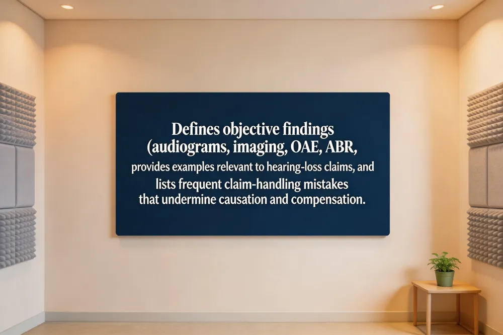 Objective medical findings are measurable, verifiable results that can be independently reviewed by qualified professionals. In the context of workplace injury claims, especially hearing‑loss cases, they include audiograms that record specific decibel thresholds at defined frequencies, tympanic‑membrane perforations documented on otoscopic images, and imaging studies such as MRI or CT scans that reveal inner‑ear pathology. Laboratory values (e.g., serum ototoxic drug levels) and functional test scores—like speech‑in‑noise performance—also qualify because they are reproducible and documented in the medical record.