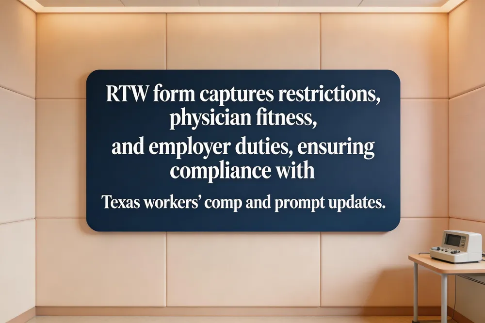 A return‑to‑work (RTW) form is a collaborative document that captures the injured employee’s medical restrictions, the treating physician’s fitness‑for‑duty certification, and the employer’s proposed modified duties. By detailing the injury date, job‑task analysis, and allowable activities, the RTW form creates a structured plan that protects the employee’s earning power, satisfies Texas Workers’ Compensation requirements (Labor Code §§408.004, 408.0041; TAC §134.110), and provides the insurer with a clear record for benefit eligibility. The form must be completed promptly after medical clearance and updated as the employee’s condition evolves.