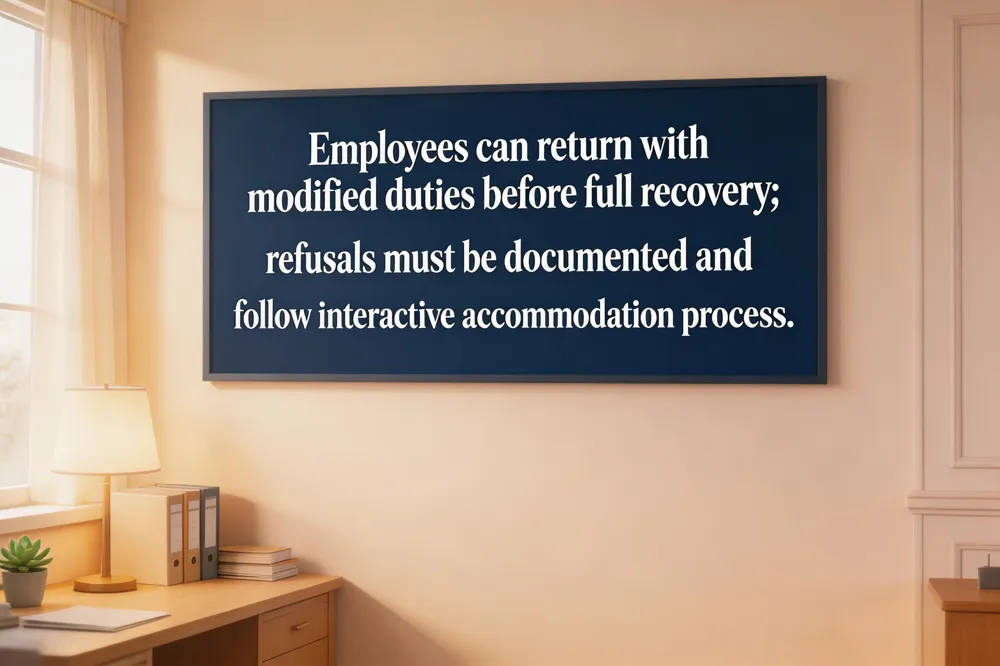 Do you have to be fully recovered to return? No. A modified‑duty role that fits doctor‑approved restrictions permits return. Coordinate with physician, claims adjuster, and employer to define safe tasks and adjust duties as healing progresses.