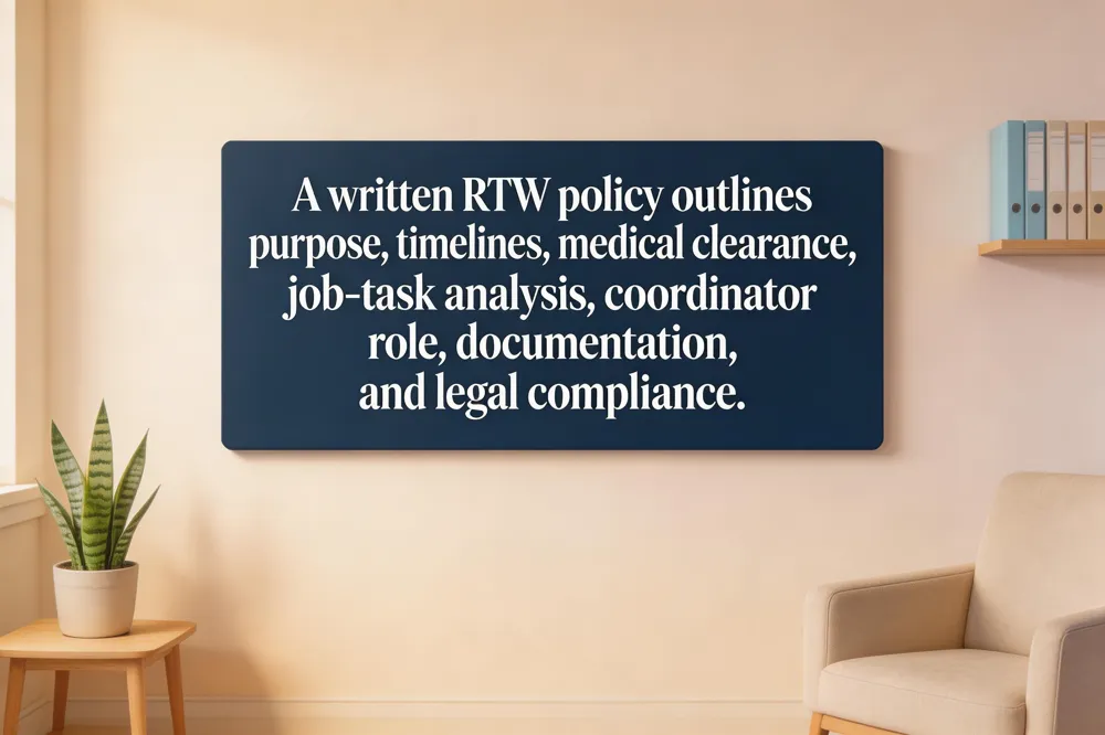 Key elements of a written RTW policy include: (1) a purpose and scope that apply to all employees returning from workers’‑compensation leave; (2) notification timelines (e.g., five business days before return); (3) required medical clearance and a functional work‑status report (e.g., DWC Form‑073); (4) a process for identifying modified duties through a job‑task analysis; (5) designation of a RTW coordinator or case manager; (6) documentation procedures and confidentiality safeguards; and (7) compliance references to the ADA, FMLA, and state statutes.