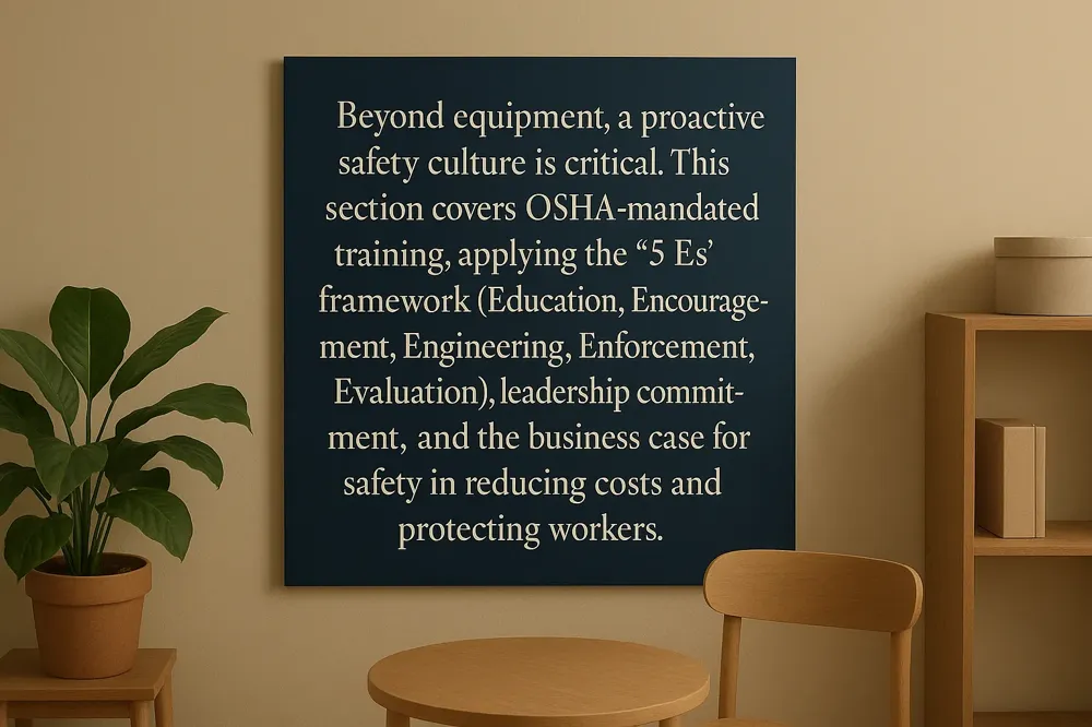 | Safety Culture & Training | Ongoing education, hazard reporting, leadership commitment, proper PPE use. | Engages workers as active participants in maintaining a safe environment. |
