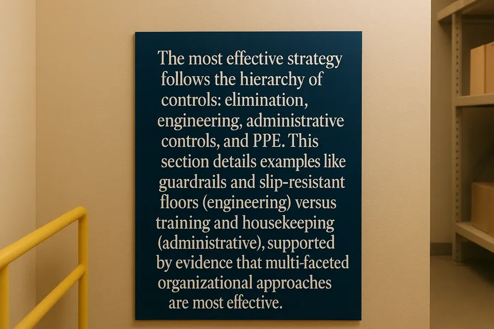 | Engineering Controls | Guardrails, slip-resistant surfaces, adequate lighting, clutter removal. | Proactively eliminates or separates workers from hazards. |