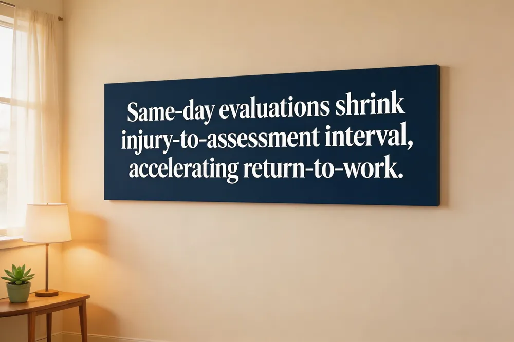 Rapid Assessment Clinics (RACs) deliver same‑day or next‑day evaluations, shrinking the injury‑to‑assessment interval from the typical 5‑7 days to under 24 hours. Studies show workers seen within 48 hours return to duty 20‑30 % faster and reduce claim costs by up to 30 %.