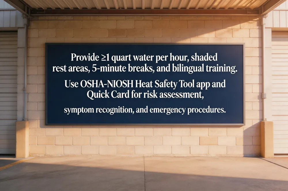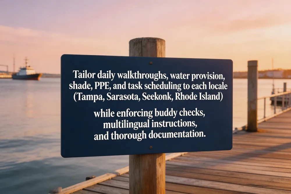 Employers in Sarasota, FL should start each day with a walk‑through to locate hot zones and verify shade structures, reflective barriers, and ventilation. Provide at least one liter of cool water per hour, schedule frequent hydration breaks, and adjust work‑rest cycles to early‑morning or evening hours. Use a buddy system, post multilingual emergency‑response instructions, and train staff on heat‑hazard identification, symptom recognition, and first‑aid/CPR.