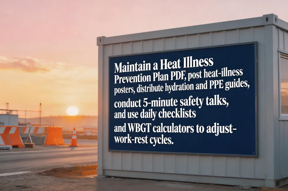 A comprehensive Heat‑Illness Prevention Program starts with a written Heat Illness Prevention Plan PDF that documents risk‑assessment criteria (WBGT, humidity, workload, PPE), water‑and‑shade provisions, training modules, and emergency‑response steps. Post this plan, and a heat‑illness poster, in high‑traffic areas to reinforce symptom recognition (dehydration, heat exhaustion, heat stroke) and immediate actions (move to shade, hydrate, call 911). Supplement the plan with concise Heat Safety PDFs—such as the National Weather Service guide—that outline hydration schedules (≈1 L per hour), breathable clothing, and heat‑alert thresholds. Conduct 5‑minute safety talks and use daily heat‑stress checklists to verify water availability, shade structures, acclimatization status, and buddy‑system checks. Employ assessment tools like OSHA’s WBGT calculator or the NIOSH Heat Safety Tool App to adjust work‑rest cycles in real time. Together, these documents, visual aids, and checklists create a defensible safety system that protects workers, supports injury‑assessment documentation, and meets OSHA’s General Duty Clause.