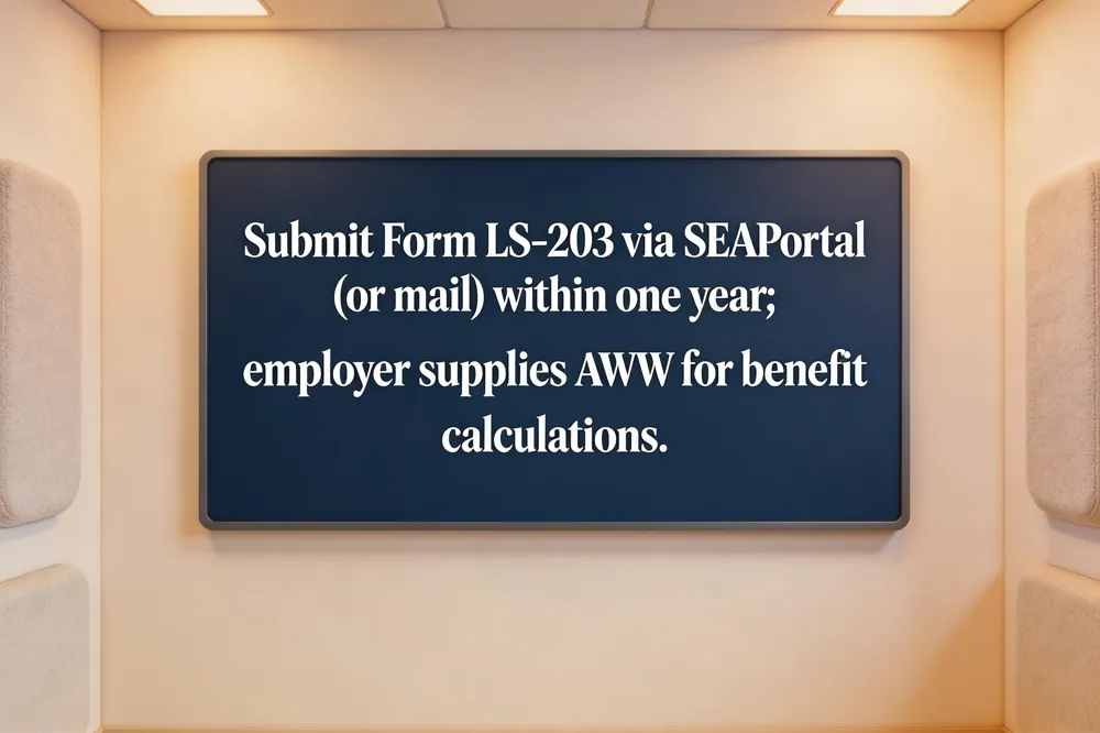 After the injury report, the claimant must submit Form LS‑203 (Employee’s Claim for Compensation) to the Office of Workers’ Compensation Programs (OWCP). The claim can be filed electronically through the Secure Electronic Access Portal (SEAPortal) or by mail, and it must be received within one year of the injury date (or one year of the last employer‑paid benefit). The employer is required to furnish the claimant’s Average Weekly Wage (AWW) and other wage data using Form LS‑426, which the OWCP uses to calculate disability benefits.