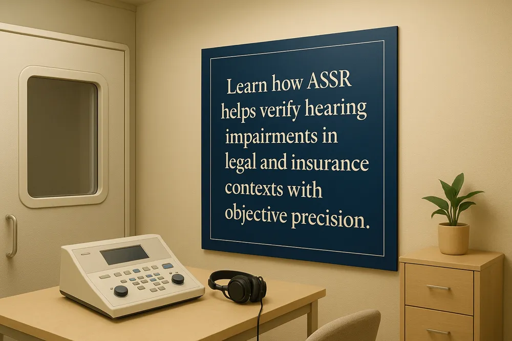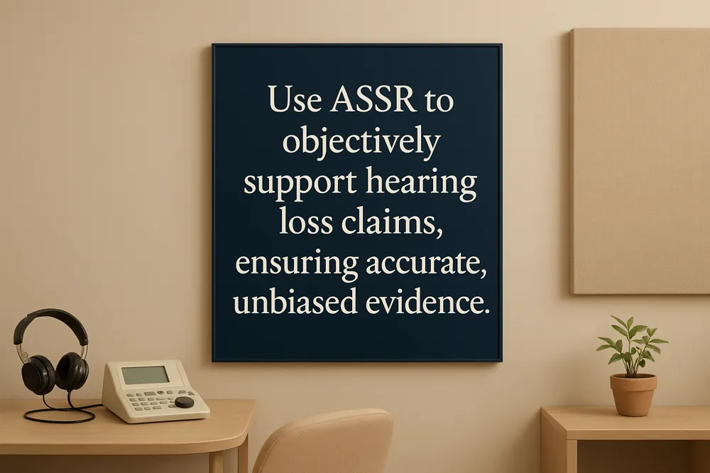 ASSR provides objective, quantifiable data required in medicolegal and workers’ compensation claims, especially for noise-induced and occupational hearing loss (ASSR test for noise-induced hearing loss; medicolegal hearing loss assessment). Its ability to document auditory function objectively helps verify claims in cases where subjective behavioral tests may be unreliable or disputed. Using ASSR improves the accuracy of disability evaluations and supports fair adjudication by offering reproducible evidence of auditory thresholds relevant to hearing-related injury claims (Legal and insurance hearing loss evaluation; ASSR suitability for medicolegal injury claims.