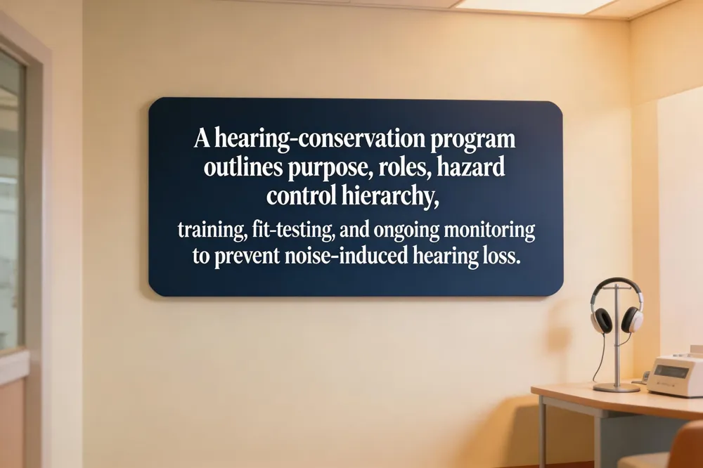 A highïquality hearing‑conservation program for a workplace with auditory‑risk activities can be organized into five sections. Purpose and Scope states the goal of preventing noise‑induced hearing loss for all employees, contractors, and visitors. Roles and Responsibilities assign duties for noise assessments, equipment maintenance, and enforcement of hearing‑protective devices. Hazard Identification and Control follows OSHA’s hierarchy: eliminate noisy processes when possible, substitute quieter equipment, apply engineering controls such as sound‑attenuating enclosures, limit exposure through administrative controls (job rotation, shift scheduling), and provide properly fitted PPE as a last line of defense. Training and Communication requires initial and refresher instruction on hearing‑conservation practices, fit‑testing of earplugs or earmuffs, symptom reporting, and documented attendance. Monitoring, Evaluation, and Recordkeeping mandates baseline and periodic audiometric testing, inspection of protective gear, and maintenance of logs to demonstrate compliance and support legal or insurance claims.